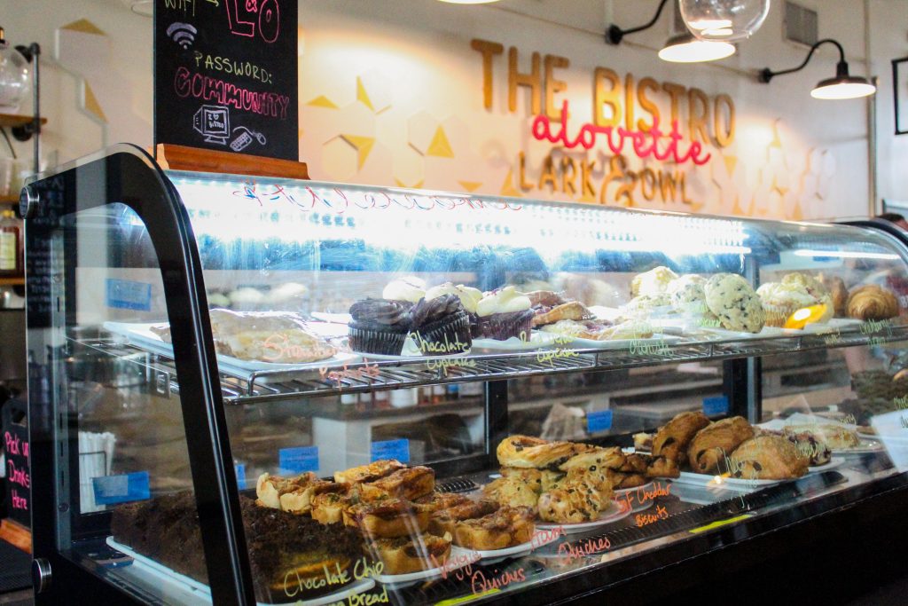 Lark and Owl is a community focused establishment, often hosting open mics, book signings, and weekly activities!, and the perfect place to browse some book titles while you wait for your coffee!