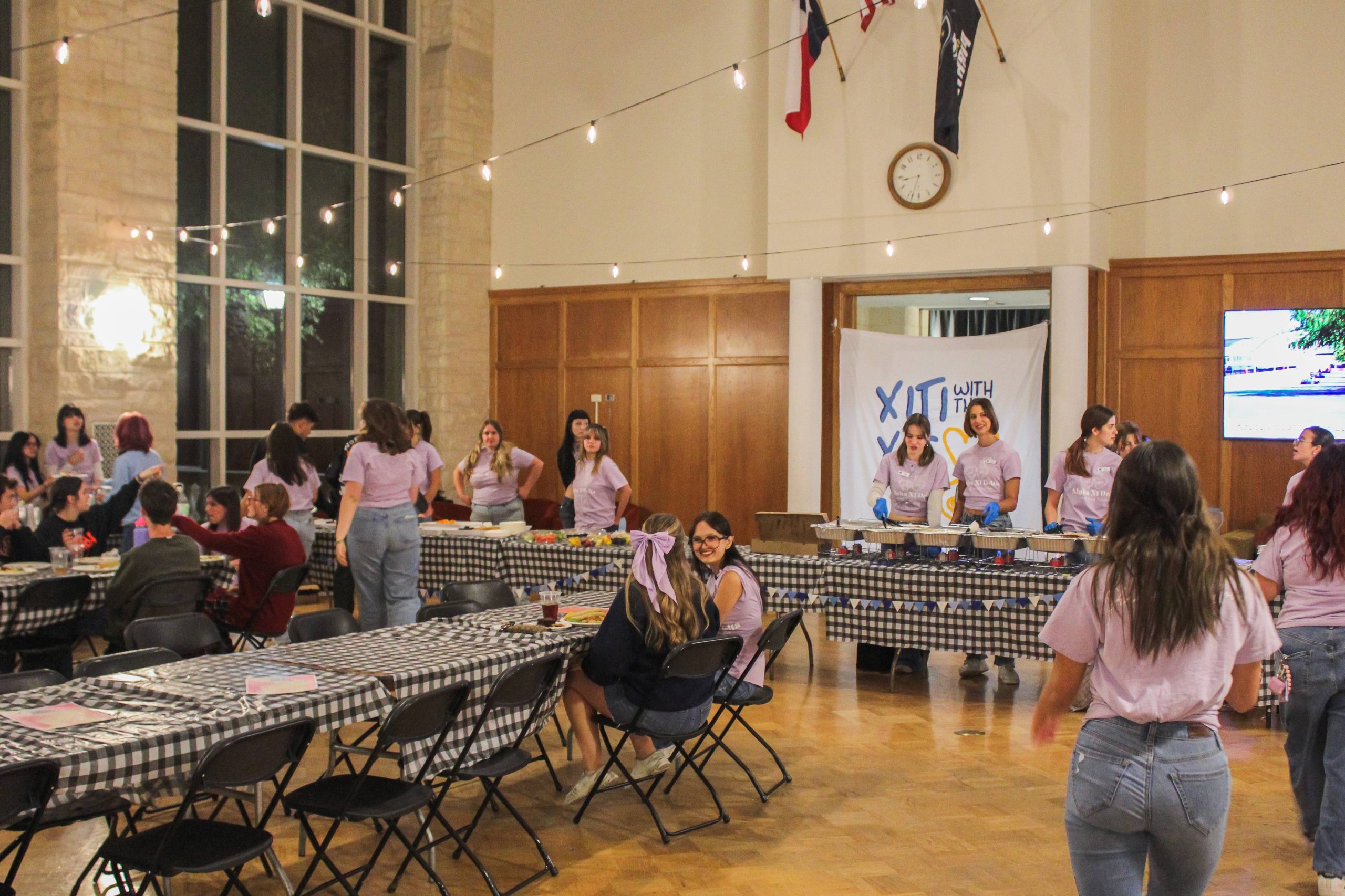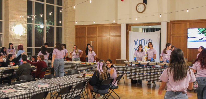 On October 29, 2025, Bishop’s Lounge came to life under twinkling lights as dozens of students clad in blue jeans and matching lavender t-shirts served pasta, breadsticks, and homemade desserts to an ever-growing crowd of hungry students. The hall was decked with blue and gold balloons, colorful fabric garlands, and a hand-painted banner featuring the words “Xiti with the Xis” in bubbly blue letters.